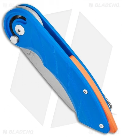 This Blade HQ Exclusive Radius model has a blue G-10 handle, an orange G-10 backspacer and a bead blasted N690 blade.