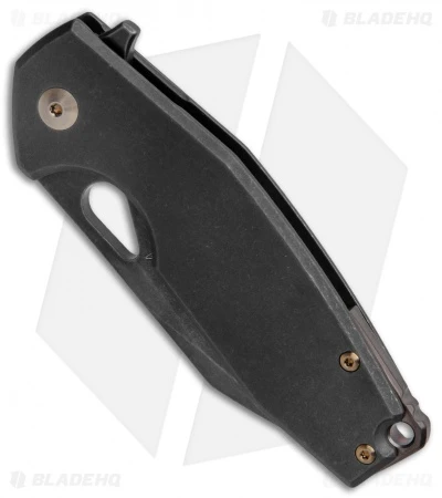 - CPM-S90V blade steel with a black stonewash finish in a reverse tanto shape.